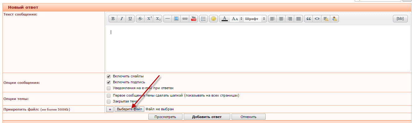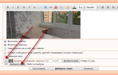 Для того что бы вставить фото на форум, внизу окошка Новый ответ есть графа Прикрепить файл. Нажимаем на кнопку Выберите файл