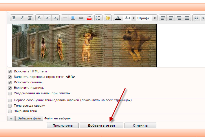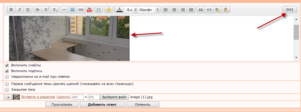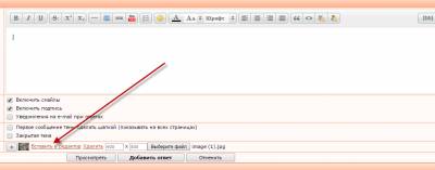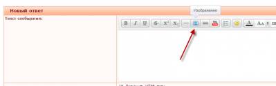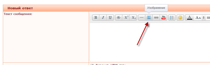 Рассмотрим пример загрузки изображения через панель инструментов в окне Новый ответ
