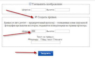 2. В нижней части страницы ставим галочку на Создать превью. Поставить размер превью, например 250. Нажимаем Загрузить.