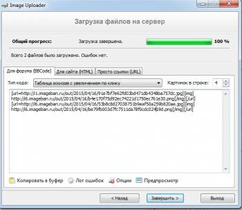 Для завершения загрузки файлов на хостинг фотографий жмём [Завершить] и дожидаемся, пока Image Uploader соединится с сервером